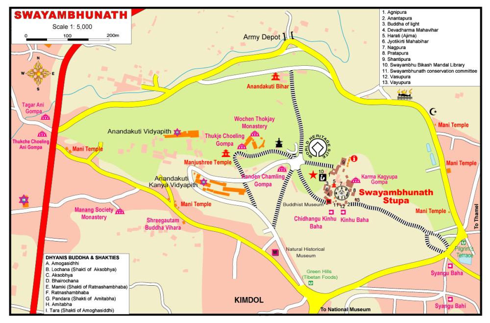 Manjusristhan is one of the 50 Buddhist Power Places acc. Keith Dowman and the western of the twin peaks of Swayambhu Hill. The suffix -sthan (nep.) means place or location.