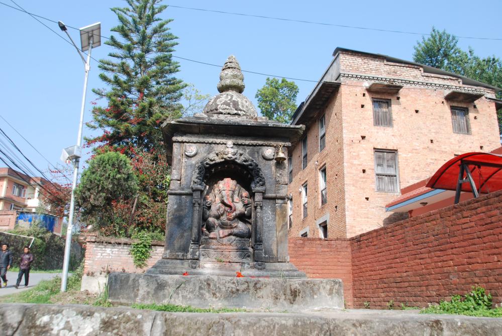 Ganesh Shrine with a Sculpture of Ganesh at the beginning of the Temple Area. This Shrine is depicted as Fig.26 in my publication "Friedhelm Nunnemann, Shrines in the Kathmandu Valley" (2022). |